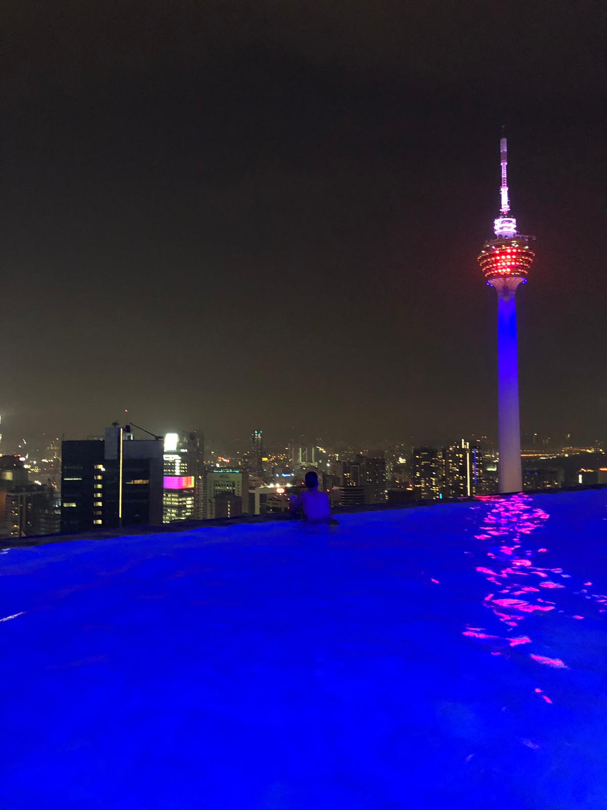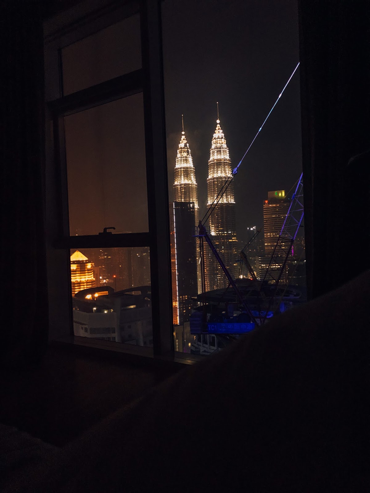 De repente se puso a llover así que nos tuvimos que ir corriendo a nuestro hotel. Y sí terminó nuestro primer día en Kuala Lumpur mirando las luces de las Torres Petronas.